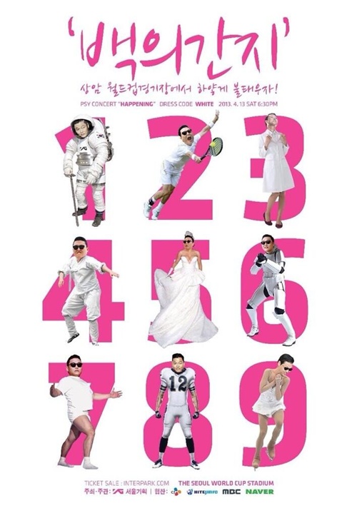 On April 13th, Psy willbe having his own concert ‘HAPPENING’ at World Cup stadium in Sang-am dong, Seoul. This photo was made to announce that audiences coming to the concert must wear in white.