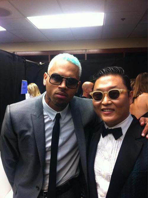 The photo was taken at 2012 MTV VMA's where Psy was invited to be a VIP guest as well as a presenter. Psy has become pretty famous among international stars. Chris Brown poses coolly with Psy putting his arm around Psy's shoulder and Psy shows a big smile.