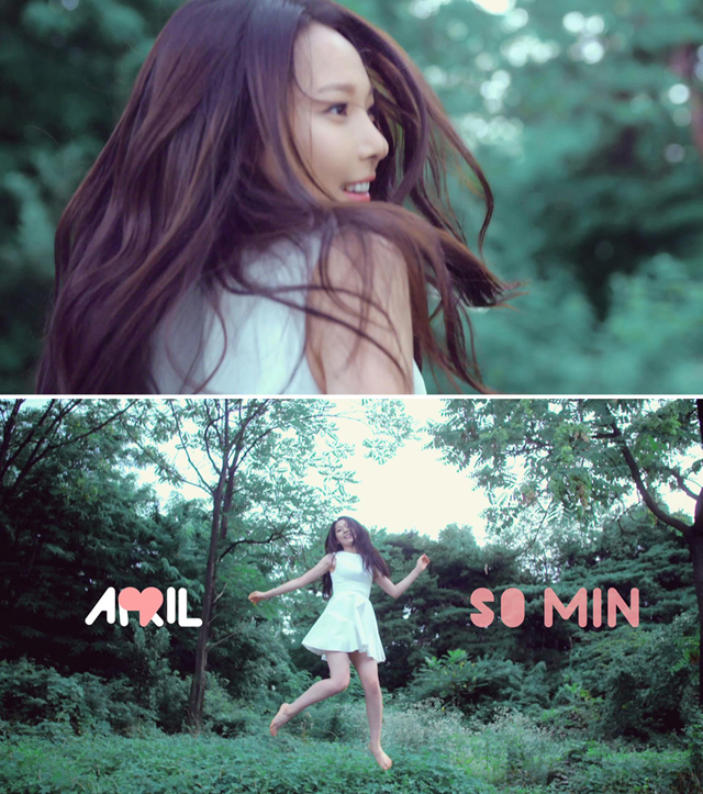 The video features Somin dressing in a simple white dress and jumping in joy while being in a green forest, giving off a dreamy yet fresh atmosphere.