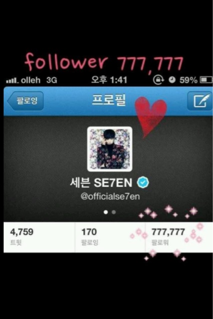 On December 3, Se7en tweeted, “OMG!!! Finally 777,777 followers!! Thank u sooooo much~ Love yall.” He also included a screen shot of his Twitter profile, showing proof of 777,777 “Lucky 7s” (Se7en’s fan club) most of whom are committed fans curious about the singer’s daily life.
