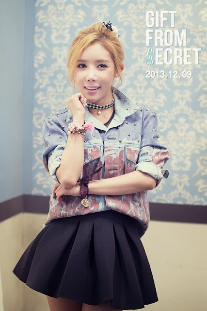 Today, SECRET reveal Sunhwa and Hana's teasers for 'Gift From Secret'. In the photo, Hana is wearing a studded denim jacket and pleated black skirt giving a carefree youthful image. On the other hand, Sunhwa appears lovely in her pink top and black&white checkered skirt as she smiles sweetly while holding bells.