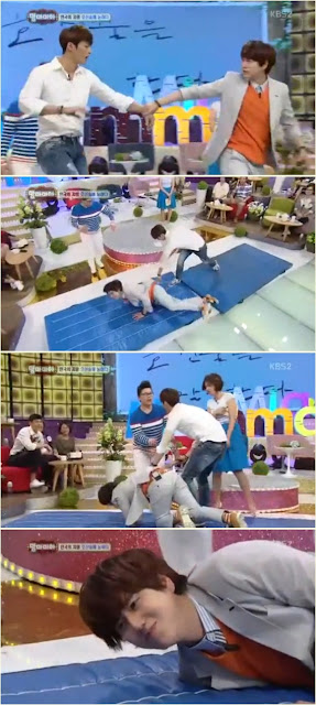 When they asked In Guk to show his hapkido (self-defense) skills, Kyuhyun was chosen to be his partner.