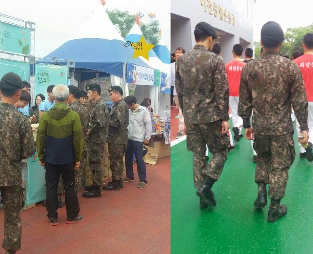 Photos of the the two artists are uploaded on SNS and began circulating as both are spotted standing next to each other at the Incheon National Sports Open Ceremony today where they help distributing goods as part of 55th Division Military Band.