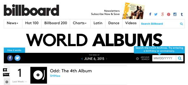 Billboard's 'World Albums' chart shows that SHINee's 'ODD' surpassed other albums from around the globe as it topped the chart. It bested albums of Celtic Thunder, Buena Vista Social Club, Jesse Cook, BABYMETAL and others.