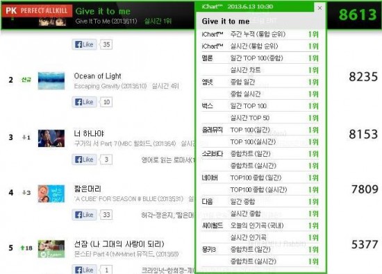 On June 11th, SISTAR released their second official album and the title song “Give It To Me” swept all of South Korea’s major real-time music charts. The single also ranked first on the iChart on Instiz, certifying a ‘perfect all-kill’ on the chart.