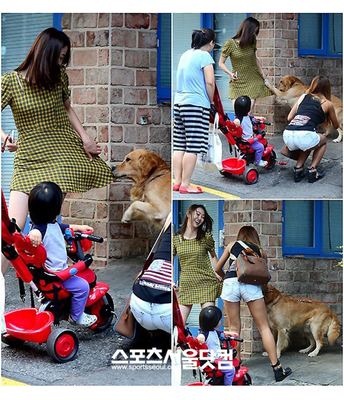 At first, Hyorin and Dasom got friendly with a golden retriever and Dasom can be seen taking a photo of Hyorin petting the cute and cuddly dog. However, when Dasom was busy playing with a kid, the golden retriever seemed to be interested in Dasom's dress.