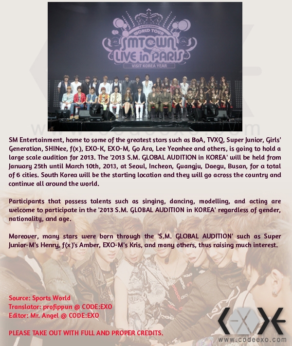 SM to hold 2013 Global Audition Kpopangelclowie18Jan 05, 2013 Share 0 comments Tags: Kpop, News, Sm entertainment, Smtown Share Previous articleNext article Leave a comment Name Email Content Post comment