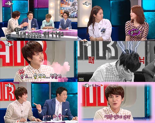 Kim Gura then said, “I bet he likes trainees” and the whole set started to laugh. As Kyuhyun was pondering, f(x)’s Krystal and Sulli, who appeared as guests on the episode, mentioned a trainee named Seulgi who might have stolen Kyuhyun’s heart. Kyuhyun started nodding as he said, “Seulgi is not bad.”