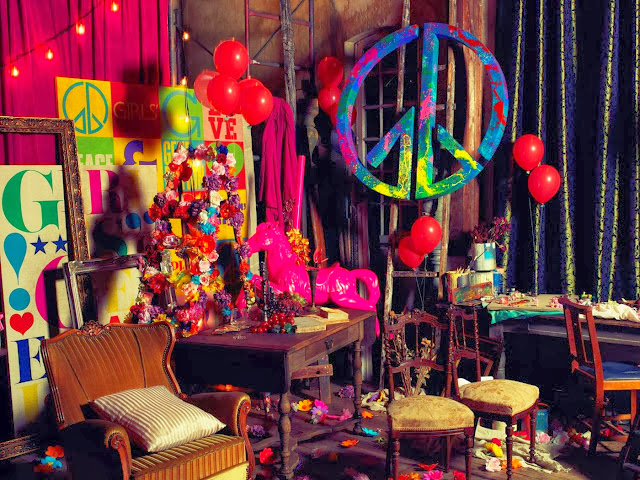 To spread love and peace, the girls wear colorful outfits and are all smiling. Their backdrop contains colorful balloons and flowers scattered on the floor giving a bright party-like atmosphere with some big symbols and letter props that form the word LOVE and PEACE.