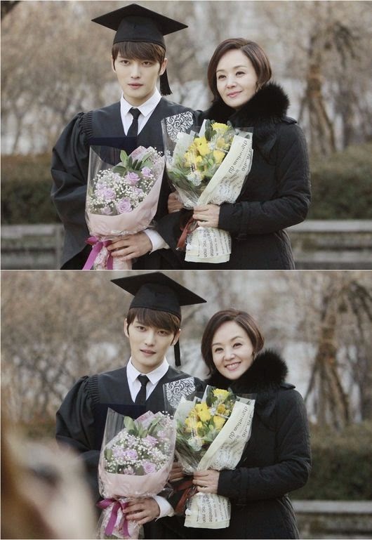 In the first set of still cuts, Jaejoong perfecly transformed into a genius NIS agent as he was dressing in a navy blue suit, showing his exceptional good look. For the second set, Jaejoong is seen wearing a toga while standing beside his on-screen mother Bae Jong Ok for a picture, depicted a scene from a normal graduation day.