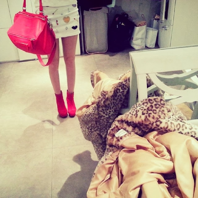 Hyomin appeared very fashionable in her latest instagram posts. She is wearing a cute and white printed matching blouse and shorts and leopard-printed coat.