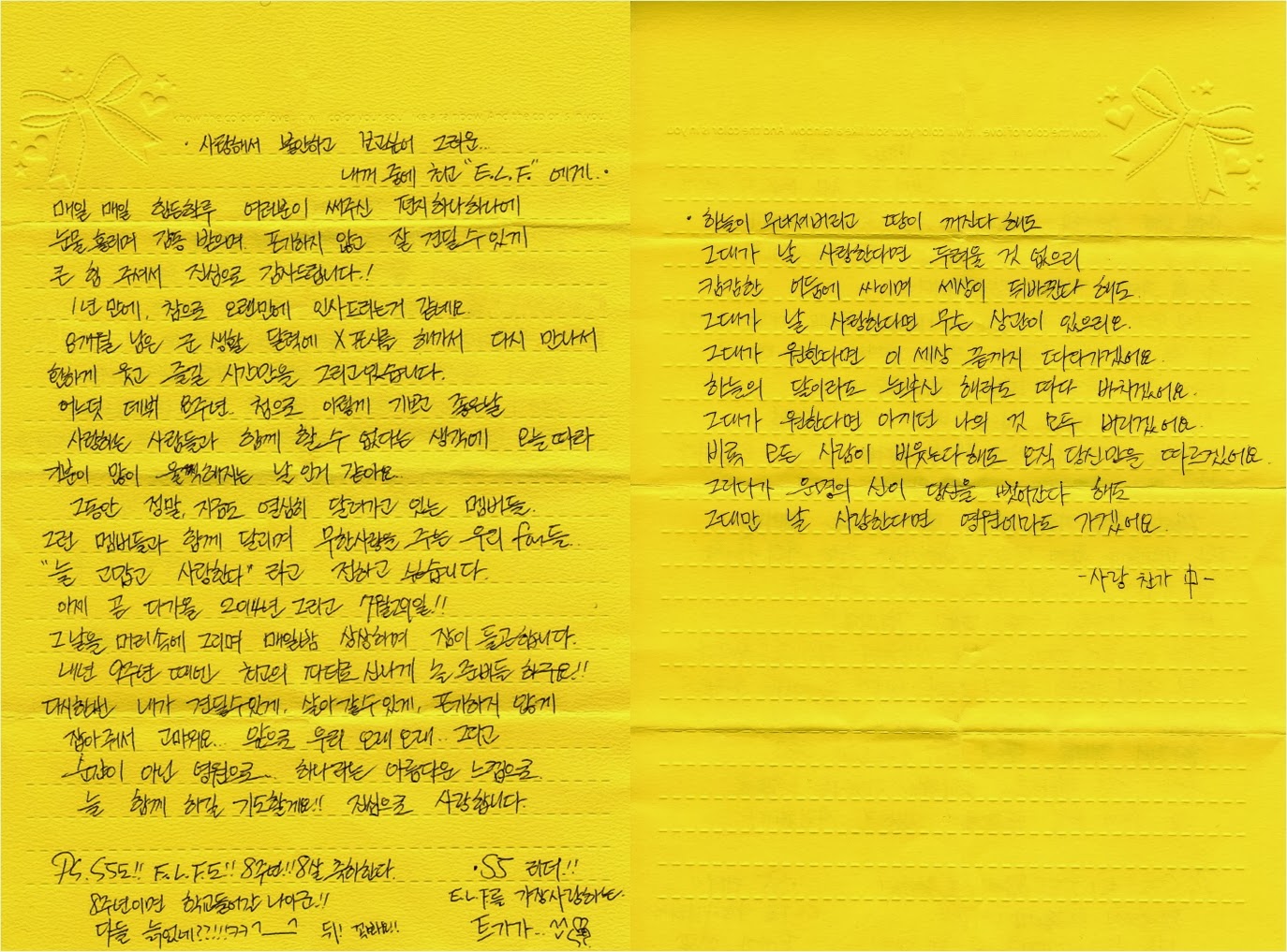 To those who I love most, whom I feel insecure about and long to see.. The best of my (possessions), "E.L.F."Everyday, after having a hard day, I shed tears and feel touched about every letters you send to me. Thank you so much for giving me the big strength to endure and continue without giving up!After an year..I think it's been very long since I greeted you guys.I am counting down the 8 months left in my army service, by putting X marks on the calendar. Waiting for the time to meet you guys again, smile brightly, and (to) enjoy the time.It's already been 8 years since debut. I think I feel more sad today, thinking about how I cannot be with those I love.Members who have been working really hard, even now..And our fans who also run with them, giving (us) endless love..I want to say "Always thank you, and love you."And 2014, and 7/29 will come soon!!I go to sleep every night, imagining the day in my mind.Everyone, be prepared to have the best party for 9th anniversary!!Thank you again for helping me endure, to live, to not give up.. Let's (be together) for a long long time.. Not just as a moment but as a forever.. I will pray so that we will always be together, with the feelings of 'We are one'!! I really love you.PS. SS5!! and E.L.F!! 8th Anniversary!! Congratulations on turning 8. 8th anniversary means it's the age to enter school!! Everyone's old now??!! kk ^___^ (You must! See the back!!)SJ Leader!!From Teukkie that loves E.L.F the most.. ^^v--back:Even if the sky were to fall, and the ground were to break apartIf you love me, I will have nothing to fearEven if the world is embraced in darkness and change completely,If you love me, what difference would it make.If you want, I will follow you to the end of this world.I can go pick the moon and the bright sun from the sky for you.If you want, I can throw away everything that was precious to me.Even if everyone were to laugh and make fun of me, I will only follow you.And even if the God of fate were to take you away,If you love me, I will follow you forever.-A Song of LoveTranslated by @NKSubs