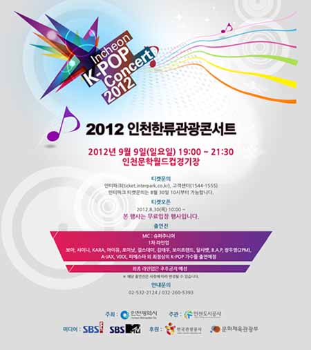 According to ‘2012 Incheon K-Pop Concert’ official website, Super Junior will act as the emcees for the festivities, which will take place for about three hours. Additionally, the initail line-up of K-Pop artists who will join in on the festival have been announced.