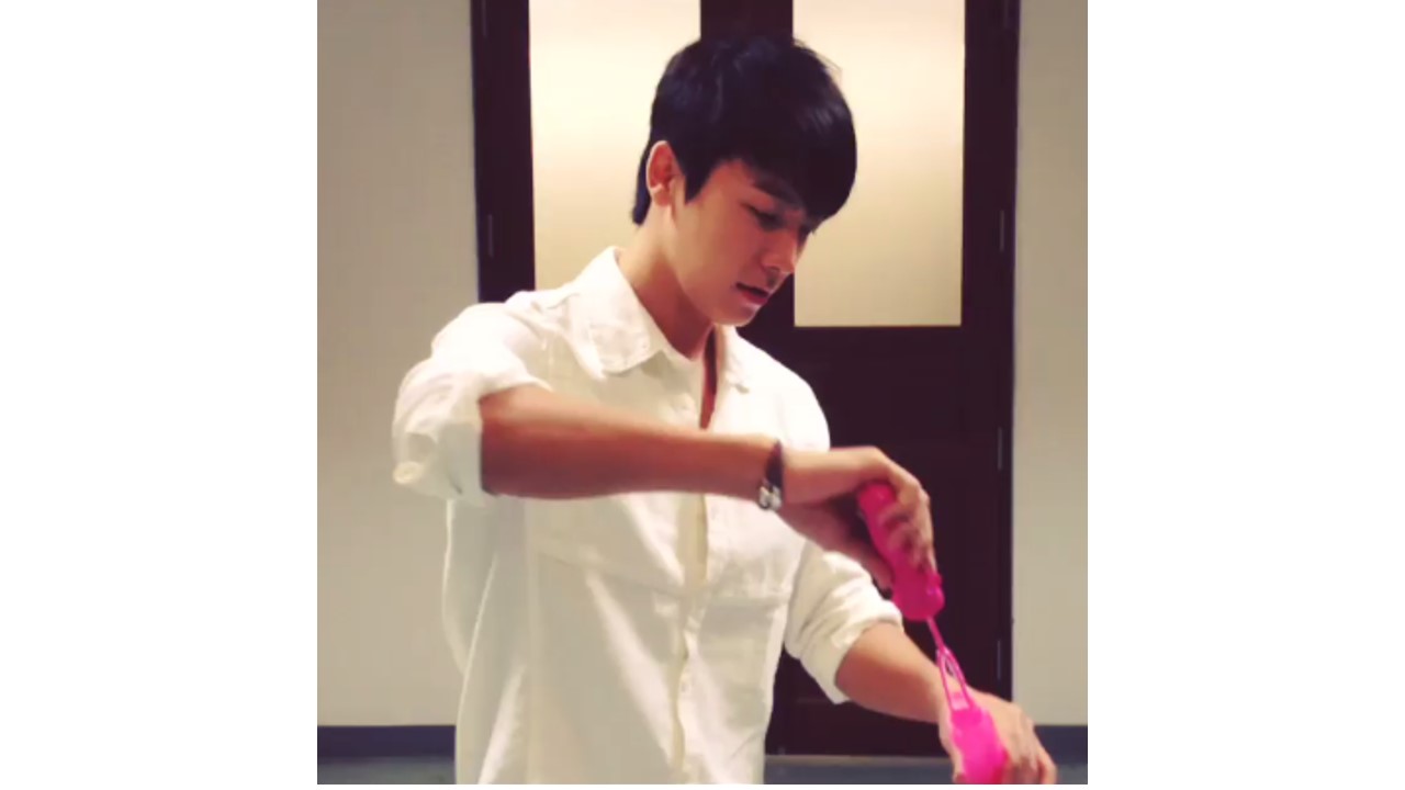 Donghae updated his Instagram with a video. He's holding a pink plastic cylinder and started to blow the bubbles. After a few seconds, Eunhyuk opened the door and was a little bit startled. However, Donghae didn't mind his presence and continued to be a kid.