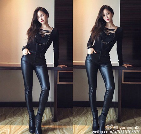 Hyomin is looking stylish in cropped top and denim shorts. She covers it up with a burgundy coat which gives a classy look, In other photo, Hyomin is so chic wearing a black top, leather pants and boots. Her slender and long legs are eye-catching.