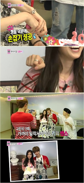 Apparently, Key and Minho were bored as there's no interaction from the couple. Key initiated and asked Taemin to hold NaEun's hand while slicing the cake which Minho agreed on. The two seemed really awkward in front of the two SHINee members.