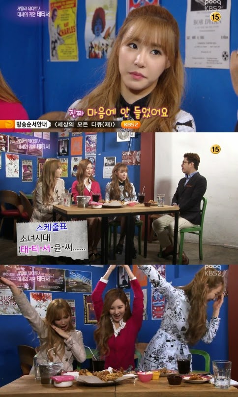 In the broadcast of KBS's 'Entertainment Weekly' on September 27th, TaeTiSeo made their appearance in the 'Guerilla Date' segment. When the reporter asked if they came up with their unit's name themselves, Tiffany frankly said,"No, we didn't really like the name. We were wondering if the unit name should be 'Twinkle' or something but our company said we should just go with 'TaeTiSeo'. We didn't believe that the name which was written on our schedule (Tae, Ti, Seo, Yoon, Sun...as abbreviation for their names) would end up being our group's name, but it really happened".