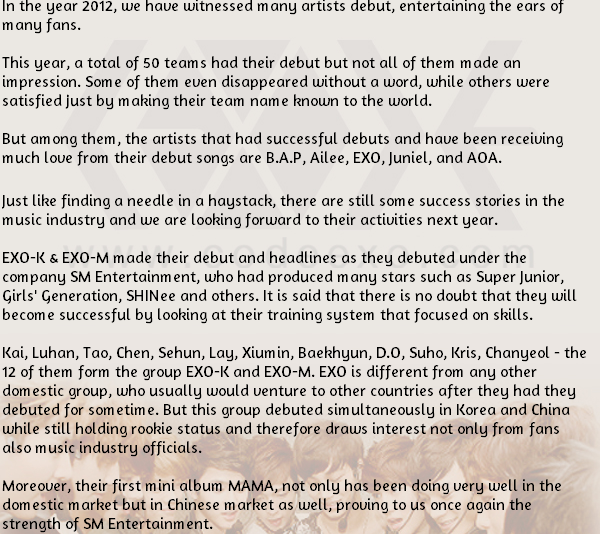 The Closing of 2012 Music Industry: EXO-B.A.P-Ailee-Juniel, the 2012 Hot Debut aileeangelclowie18Jan 02, 2013 Share 0 comments Source: HeraldTranslations by: profippun @ CODE:EXOEditor: starlight @ CODE:EXO Tags: Ailee, B.a.p., Exo, Juniel, News Share Previous articleNext article Leave a comment Name Email Content Post comment