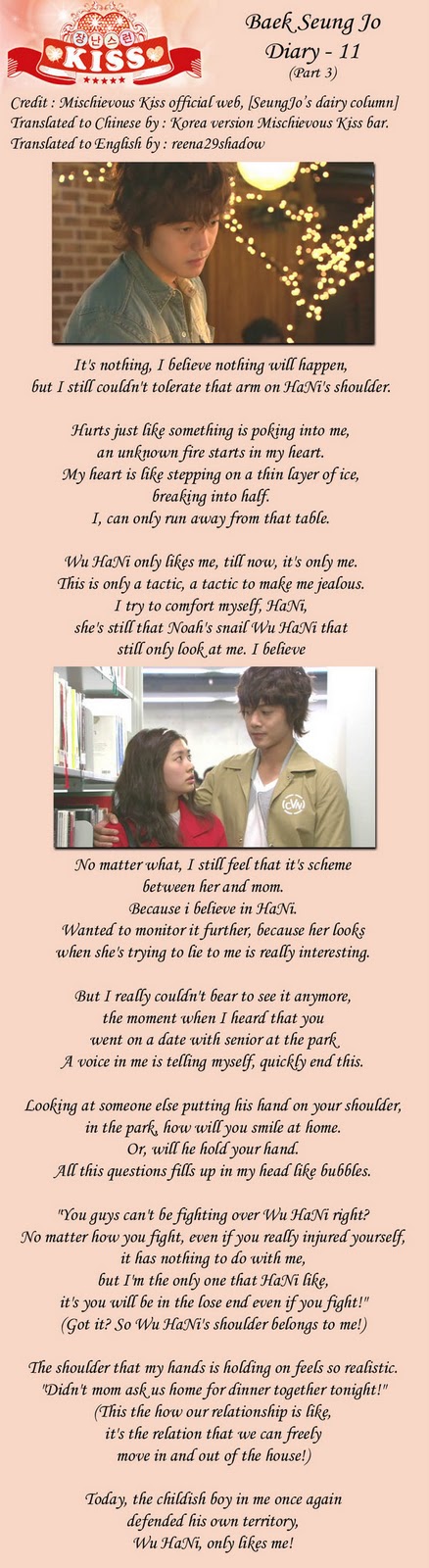 [Trans] Playful Kiss Baek Seung Jo Dairy Kim Hyun JoongchrizzycrazyOct 14, 2010 Share 0 comments cr: trans by : As taggedplayful kiss official website Please vote/re-vote for me as your favourite author of this month the poll is at the right side of http://www.dkpopnews.net/ Thank You! Tags: Kim hyun joong, Playful kiss, Ss501, Trans Share Previous articleNext article Leave a comment Name Email Content Post comment