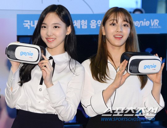 Twice Nayeon and Jihyo attend KT Music Press Conference to do a demo of Genie VR for the media.The lovely girls are twinning today wearing white long sleeves and black skirts.