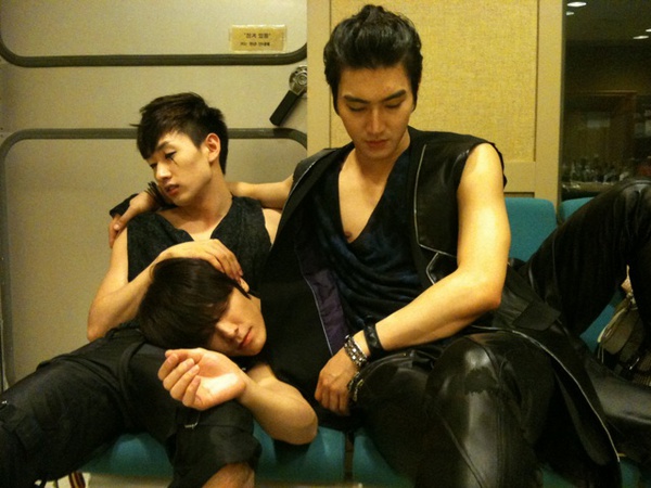 Three of them are squeezing in such a small sofa. Donghae use Eunhyuk's lap as pillow while siwon use donghae's body as mattress! Are you guys screaming now?