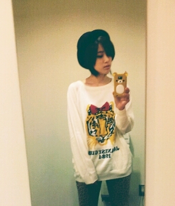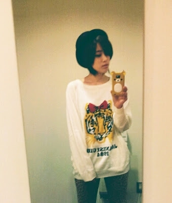 In the picture, Eunjung is seen wearing a hat and long sleeve with a tiger as a design of it while taking a picture using her cellphone with a Rilakkuma case