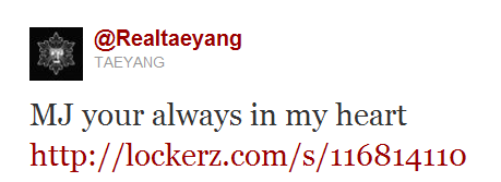 [Twitter] MJ will be in Taeyang's heart Big Bangshayne kayJul 04, 2011 Share 0 comments A loyal fanboy of MJ, none other than Big Bang's Taeyang! He posted a picture of himself in his twitter lying in MJ's star :)He tweeted," "MJ you're always in my heart." together with this pic,Anyway, he's currently taking vacation at the moment ^^Source: Taeyang's twitter Tags: Big bang, Taeyang, Twitter Share Previous articleNext article Leave a comment Name Email Content Post comment