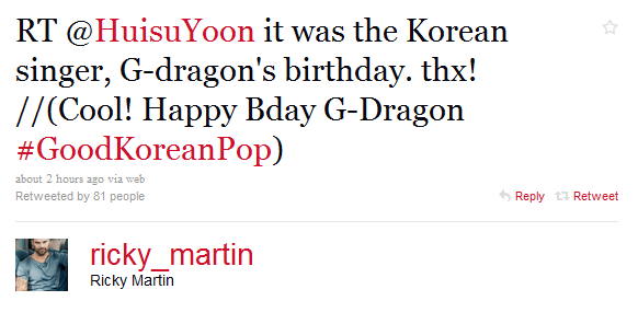 G-Dragon’s fans were able to spread his birthday celebration through the world yesterday by making him a trending topic. After rapper Flo Rida wished him a happy birthday, it looks like the topic caught the eyes of another fellow world idol. “[What] is #happygday?…happy gangster day?” The Puerto Rican singer asked his followers after watching the trending topic reach the top spots worldwide. After a Korean VIP explains the trending topic to Ricky Martin, he posted the following: