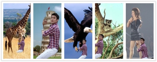 He accompanied the tweet with unusual set of photos of himself. In the edited photos he is seen clinging a giraffe, a tower and even in an eagle's leg. But the most hilarious is the last photo wherein he is clinging to fellow member Eunhyuk's legs who is cross dressed for a performance attire.