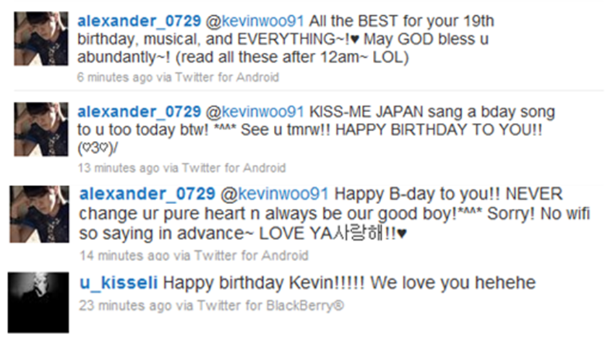 Previously, we posted a picture of U-KISS celebrating Kevin's birthday shared by Kevin himself on Twitter. Now, U-KISS's Alexander and Eli also posted birthday wishes for Kevin on Twitter.
