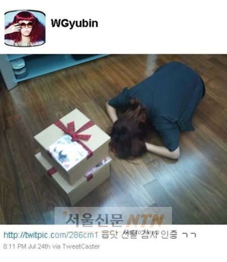 As seen on her twitter updates on 24th July, Yoobin tweeted a photo that includes her bowing down as well as a few parcels which were from her birthday gifts from fans.