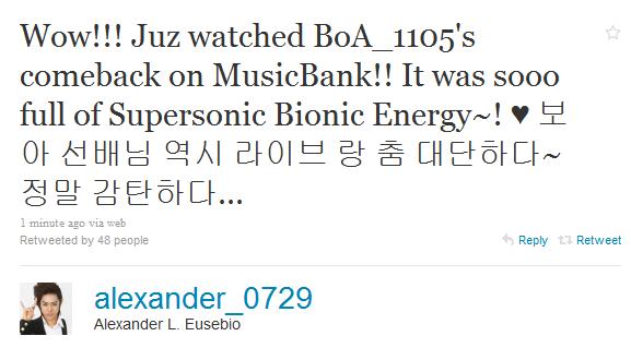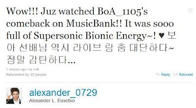 After making her long awaited comeback to the KPOP scene, BoA performed two of her newest tracks on Music Bank today. She showed everyone what she's made of and put in all her 'supersonic, bionic energy' into the performance. Not long after Music Bank ended, Xander of U-KISS started tweeting about BoA's performance. His tweet said: