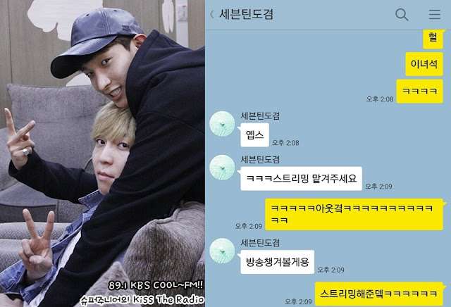 Upon the release of U-Kiss new album "Stalker", Seventeen's DK immediately sent Soohyun a proof shot of streaming which Soohyun finds to be adorable and even posts about it on his instagram. Soohyun uploads a screenshot of their Kakaotalk conversation as well,