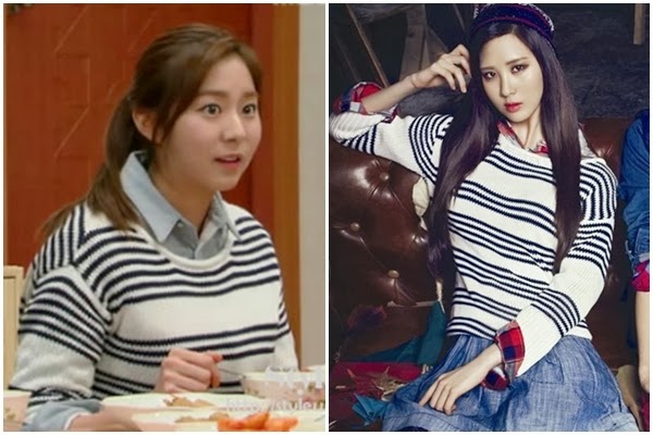 In the recent episode of "Golden Rainbow", Uee was seen wearing a horizontal striped sweater which is the same design with Seohyun's in Cosmopolitan magazine. Uee looks active and boyish with a simple blue shirt inside while Seohyun looks feminine with a plaid shirt and denim skirt.