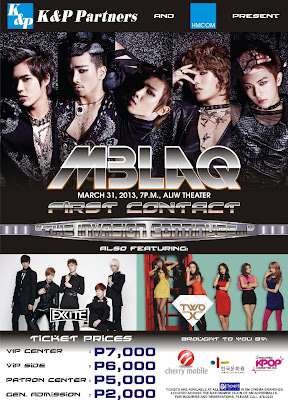 Seoul Invasion is originally scheduled to be on February 9th but due to some problems, it was moved to March 22nd and for the second time, it is moved again to March 31th, 2013 with new artists line-up and a new showcase title 'MBLAQ FIRST CONTACT "The Invasion Continues"'. The event will take place at Philippines ALIW Theater at 5PM.