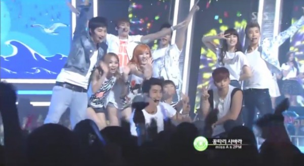 2PM and Miss A did a special summer stage at Inkigayo today! the groups perform Clon’s “KungTari Shabara” .