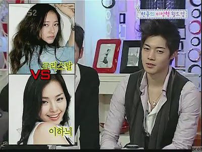 During the show,Kim Hyun Joong was asked to choose the girls she prefer and he was given a few choices.Firstly,he was asked to choose between SNSD's Jessica and f(x)'s Krystal and she selected Krystal without any hesitation.