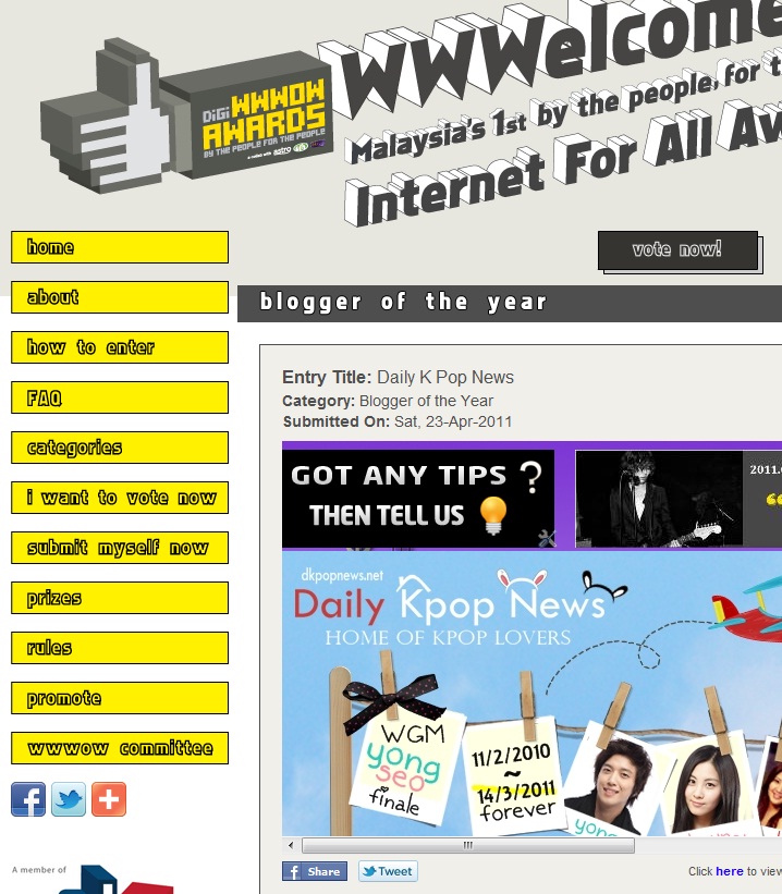 Dear DKPOPNEWS readers,our blog will be celebrating its second annual anniversary on this coming 12th May,we need your help to vote for us on the "Blogger Of The Year" category of Digi's contest.