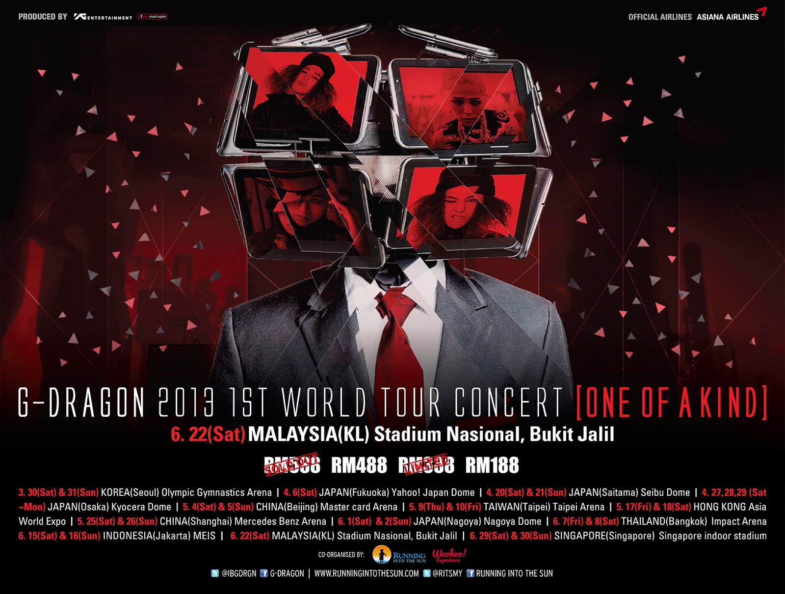 G-DRAGON 2013 WORLD TOUR: ONE OF A KIND in Malaysia concert tickets launched on 11 May 2013, and VIP tickets sold out within an hour, leaving limited Cat 3 tickets, as well as Cat 2 and Cat 4 tickets for sale. Merchandise enjoyed brisk sales during the ticket launch, and limited stocks are available for pre-sale on the RITS website page, www.runningintothesun.com