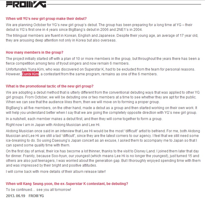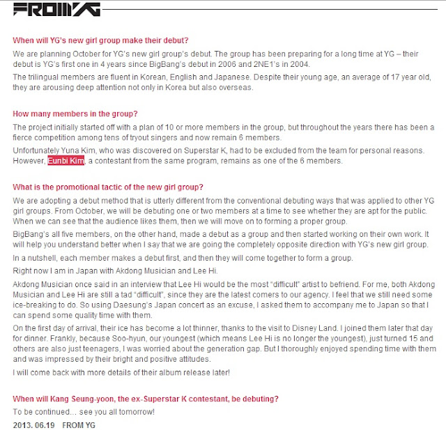 As promised on his recent post, YG Entertainment boss, Yang Hyun Suk, announce details of its upcoming new girl group through a follow-up post on YG-Life blog on June 19th.