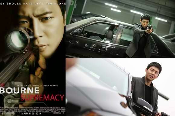 The photos are edited versions of the poster from the 2004 American-German action and spy film, 'Bourne Supremacy.' The photo of the antagonist played by Matt Damon was replaced with Yoochun's face.