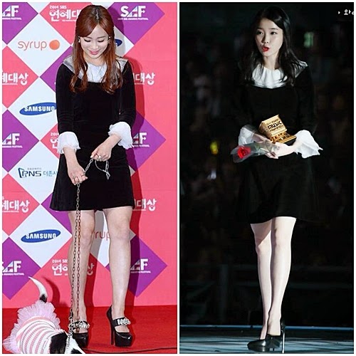 On December 30 2014, KARA's Youngji attended SBS Entertainment Awards with fellow Roommates members in a lovely black velvet dress, which has the same design with IU's at MAMA 2014.