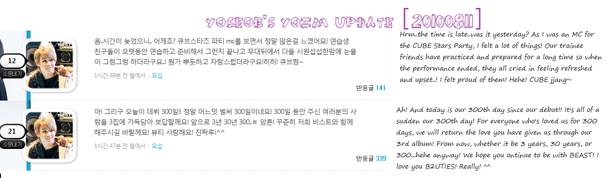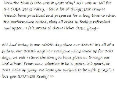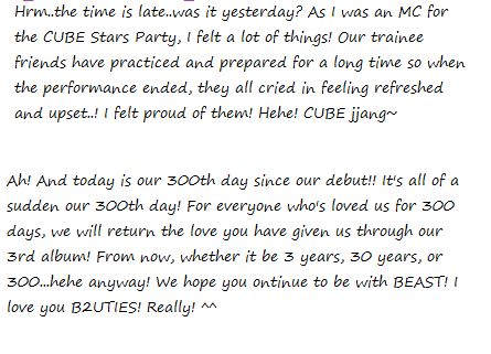 [YOZM] Yoseob's feelings for Cube Party and Beast 300th Days after debut BEASTchrizzycrazyAug 11, 2010 Share 0 comments Yoseob updated his yozm with his feelings for their Cube Summer party yesterday and Beast 300th Day after debut.He said:Happy 300th Day Beast!!CREDITS: Yoseob's Yozm (SOURCE), seoulfoood @ B2STRISING.COM (TRANS) Tags: Beast, Update, Yang yoseob Share Previous articleNext article Leave a comment Name Email Content Post comment